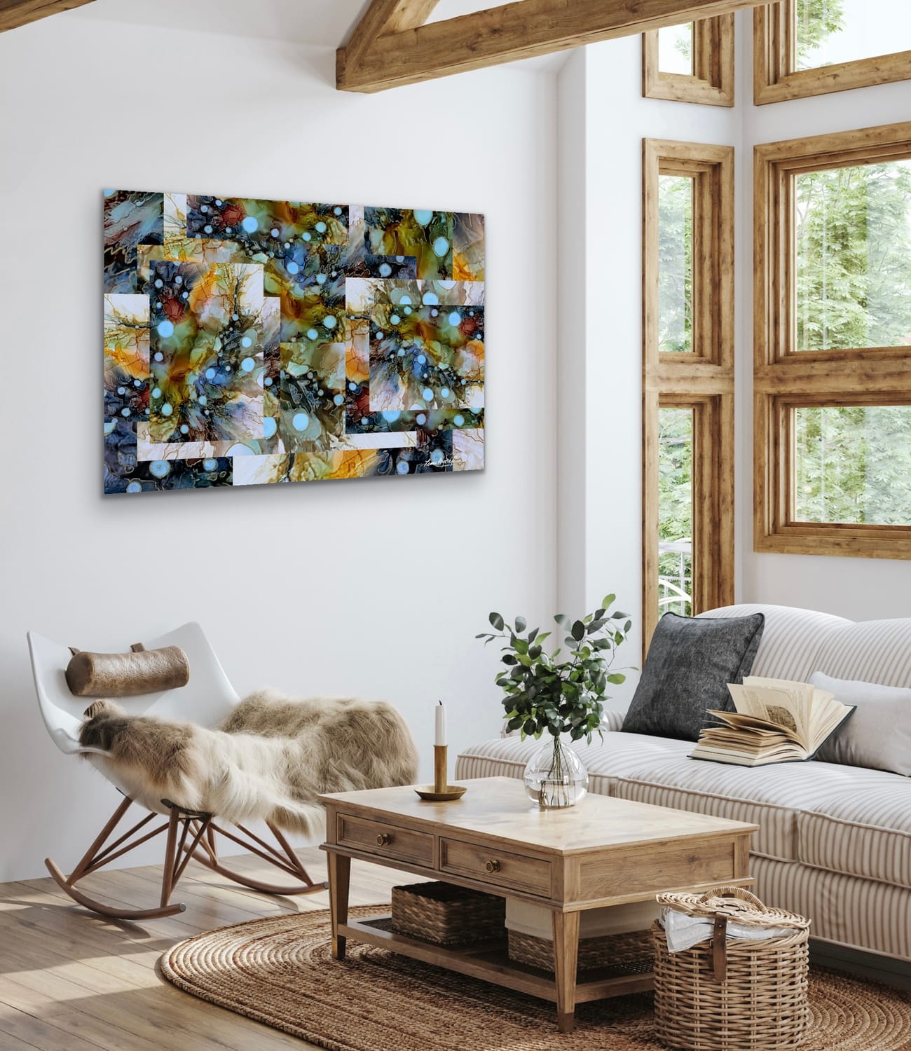 Each piece in this collection uses intentional color, layered abstraction, and fractal-inspired patterning to engage the brain, reducing cognitive overload and supporting emotional regulation.