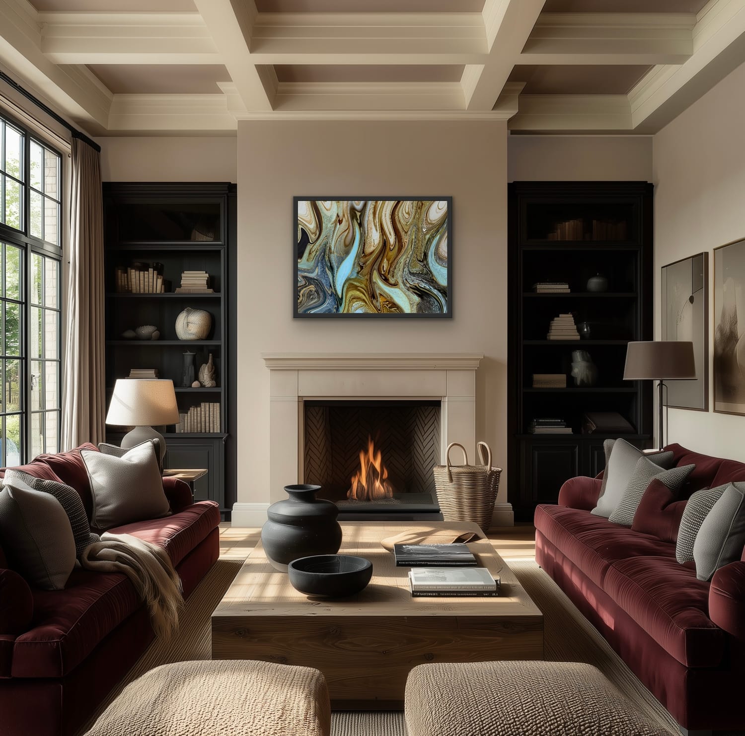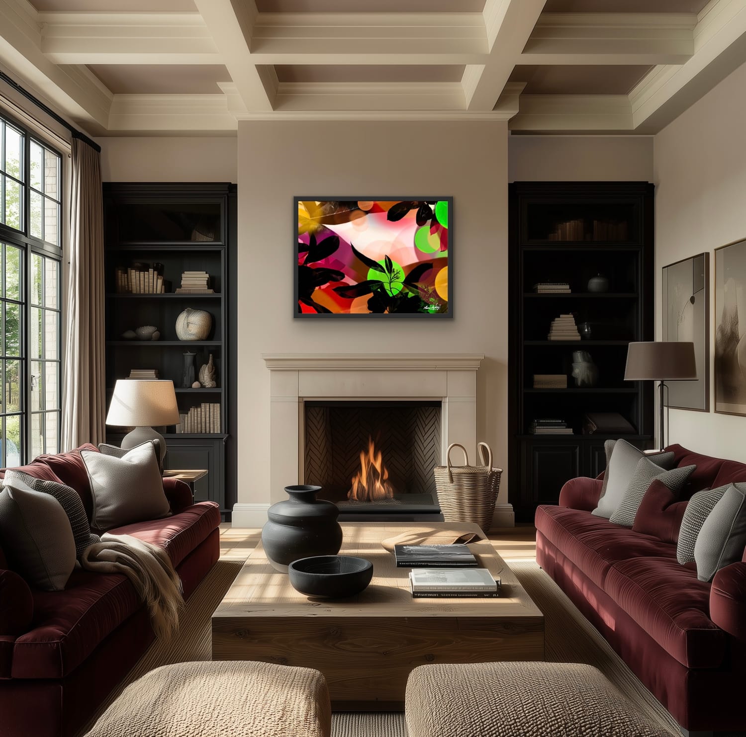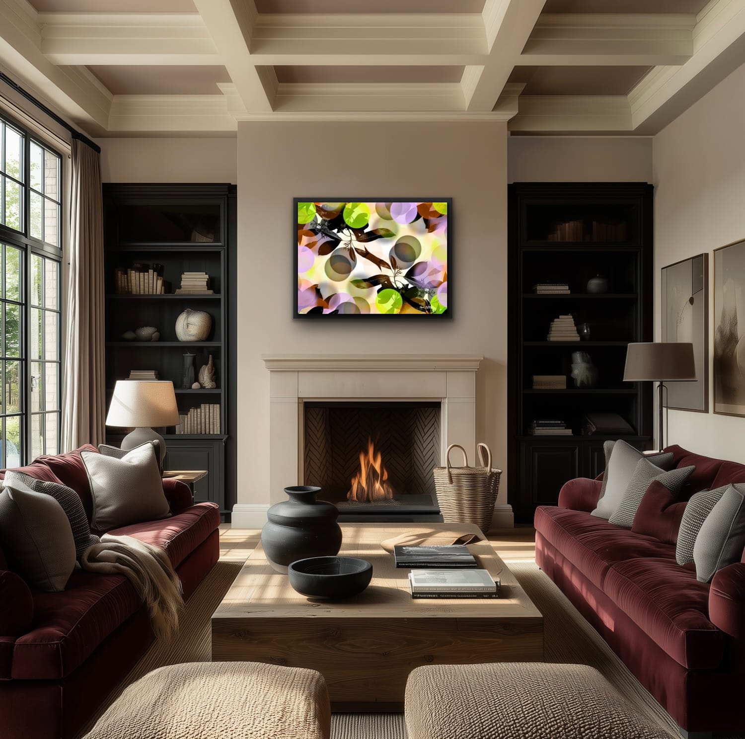 Each work is created to support calm, focus, and emotional stability through intentional color relationships, layered abstraction, and embedded fractal visual structure.